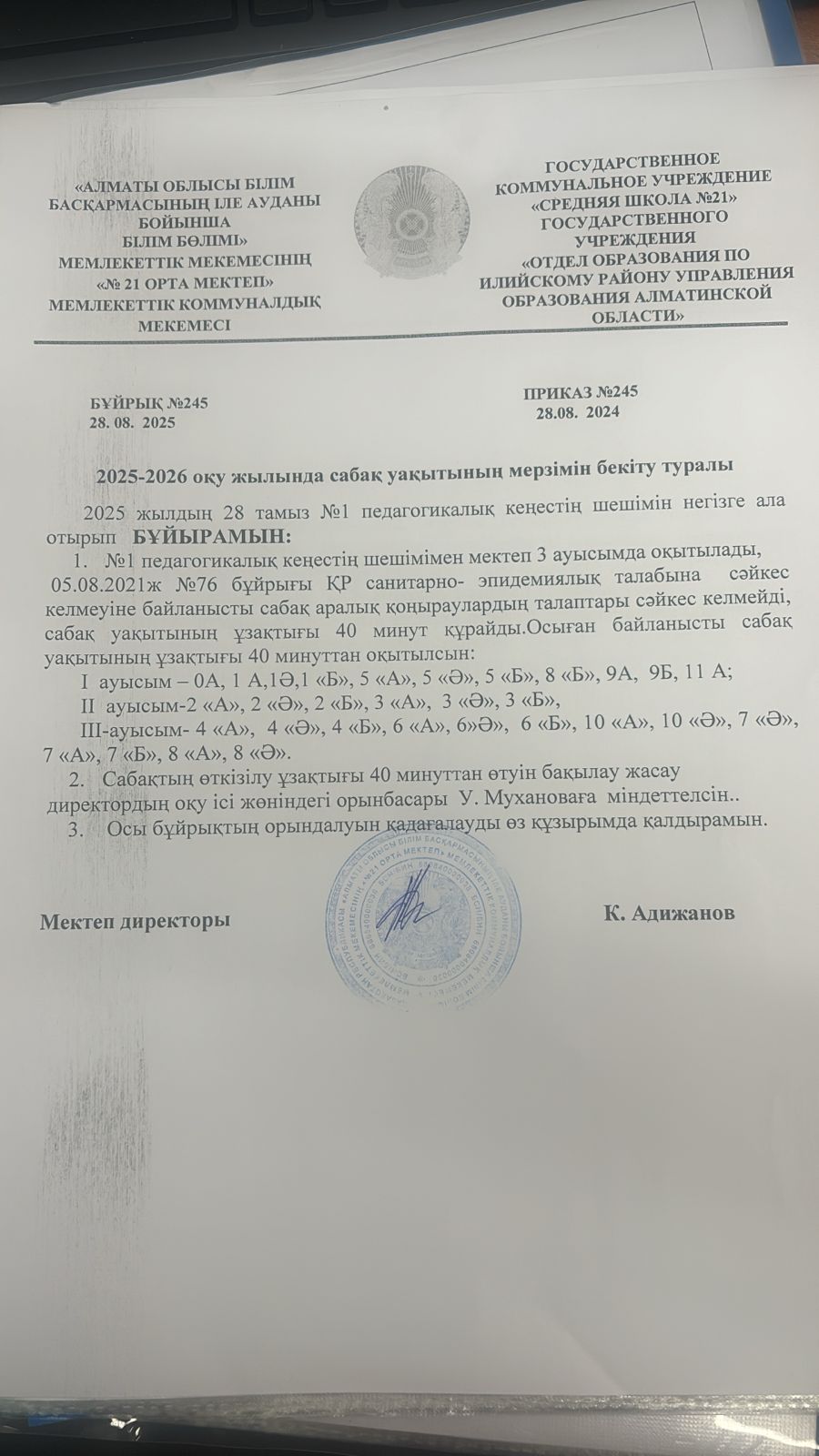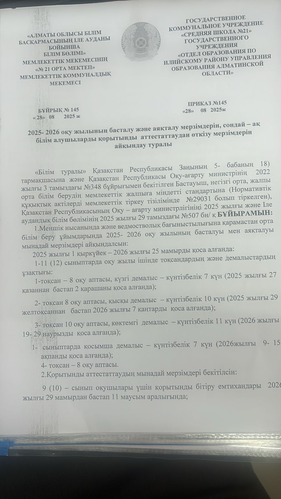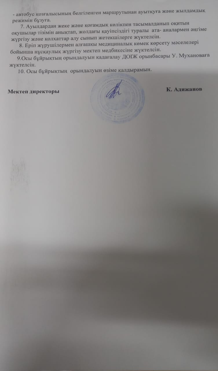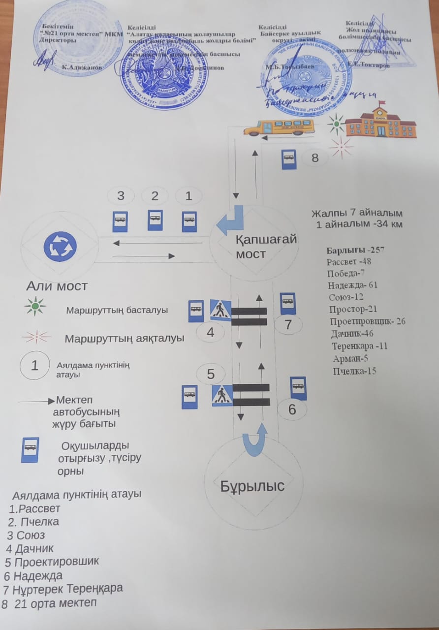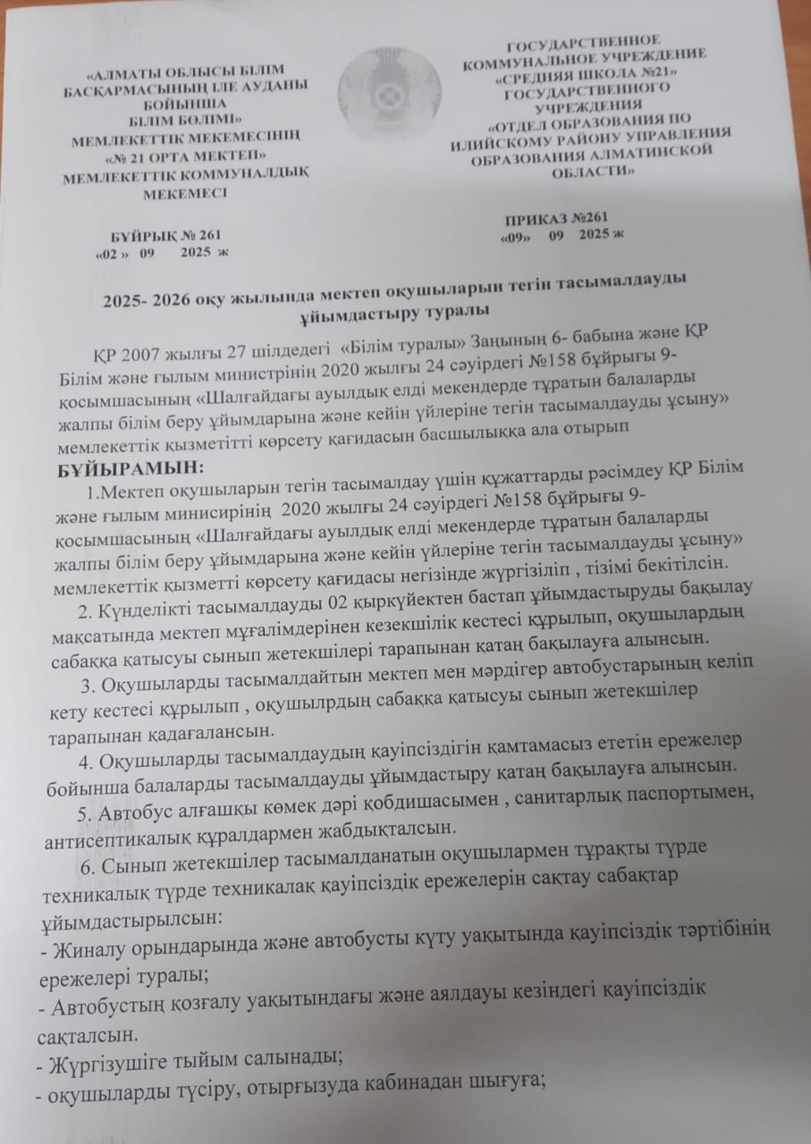 №21 орта мектеп бойынша оқушыларды мектепке тасымалдау кезінде қауіпсіздігін қамтамасыз ету, басты міндеттерінің бірі.Осыған байланысты шалғай елді мекендерден келетін балаларға арнайы автобус бөлініп,тегін тасымалдау ұйымдастырылған.