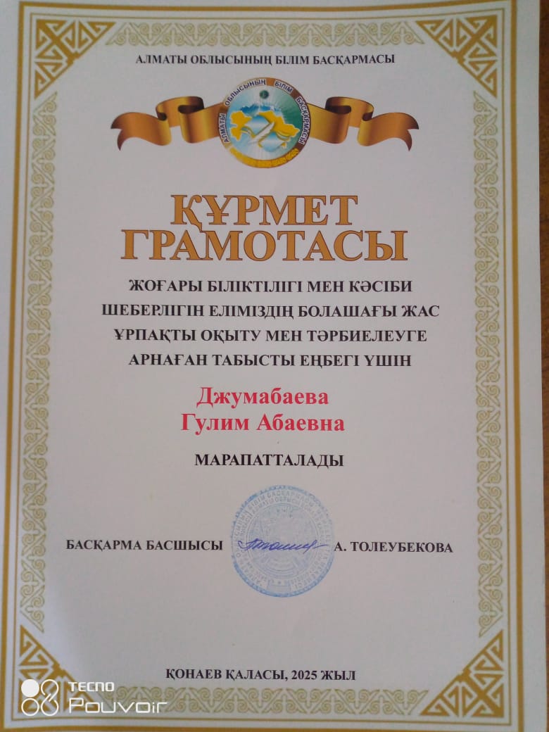 2025-2026 оқу жылындағы ауыл мектептерінің 9-11 сынып оқушыларына арналған жалпы білім беретін пәндер бойынша республикалық олимпиадасының облыстық кезеңінен тарих пәнінен жүлделі 3 орынды иеленген 11- сынып оқушысы, дарынды шәкіртіміз Қожакерім Еркеназ Есік қаласының Мәдениет үйінде марапаттау рәсіміне қатысты. Білімді жастарға қолдау көрсетіп, қуаныш сыйлаған Алматы облыстық білім басқармасына және Іле аудандық білім бөліміне айтар алғысымыз шексіз! Жетекшісі: педагог-зерттеуші тарих пәнінің мұғалімі А.С.Бердимурадова Марапат құтты болсын